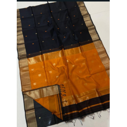 Presenting a party wear silk saree with weaving border. Maheshwari original handwoven saree Fabric silk by cotton Gold zari border and buti all over Length 6.25 with blouse contrast
