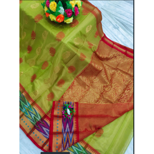 Presenting a party wear pure mangalagiri silk saree Blouse:Contrast Colour Tissue Plain Blouse Body:Saree Body Pure Pattu Zari Warp Buta Work Border:Beautiful Pochampalli Border Pallu:Contrast Colour Beautiful Gold Zari Rich Work Pallu