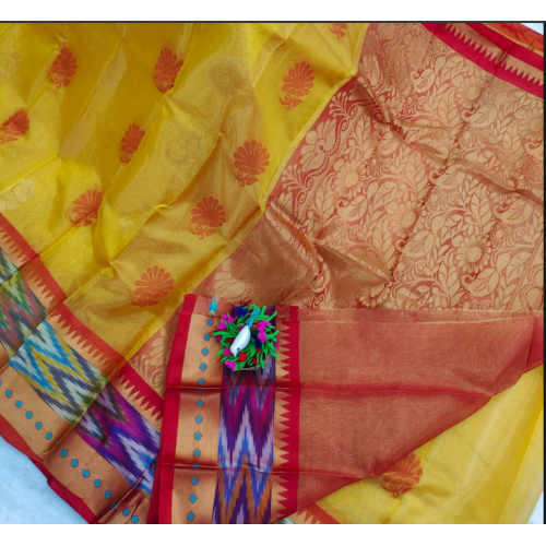 Presenting a party wear pure mangalagiri silk saree Blouse:Contrast Colour Tissue Plain Blouse Body:Saree Body Pure Pattu Zari Warp Buta Work Border:Beautiful Pochampalli Border Pallu:Contrast Colour Beautiful Gold Zari Rich Work Pallu