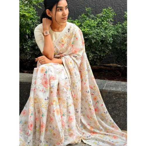 small weaving border and lace work with digital flower print all over the saree