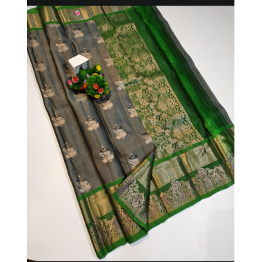 :A stunning blend of traditional Kanchipuram silk saree with craftsmanship and elegance, this saree is sure to make a statement of Jari weaving and meena work border with contrast color unstitched blouse .