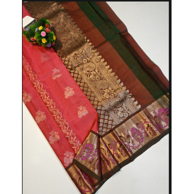 A stunning blend of traditional Kanchipuram silk saree with craftsmanship and elegance, this saree is sure to make a statement of Jari weaving and meena work border with contrast color unstitched blouse .