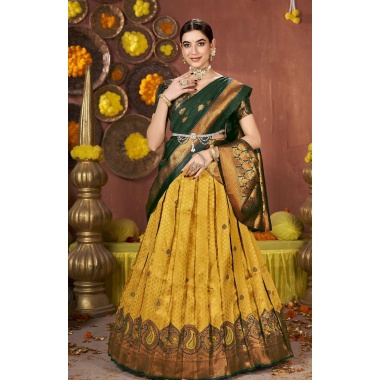 A traditional semi stitched half saree in Banaras silk fabric with weaving pattern.