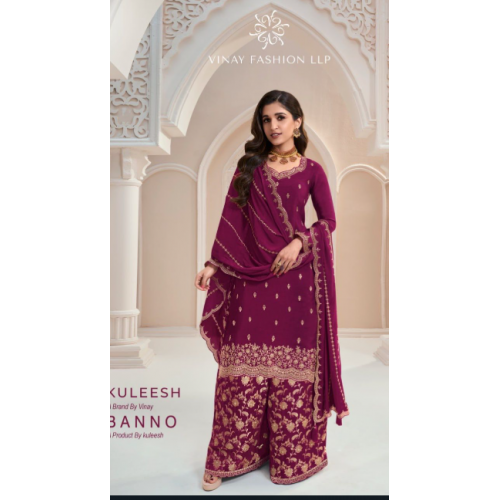 salwar suit in chinon fabric with heavy embroidery work .