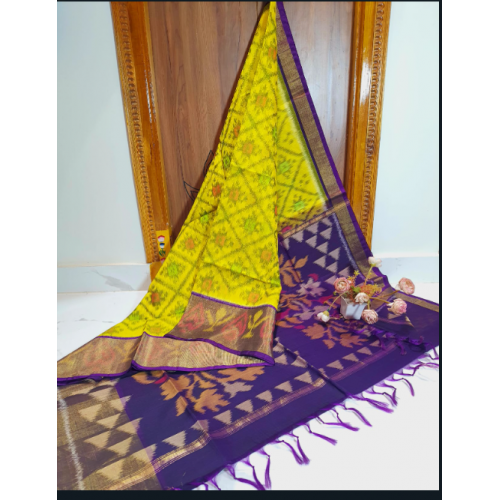 A beautiful pattern of ikkat design in sico Pattu saree with a big handloom weaving border with a contrast color pallu and unstitched blouse
