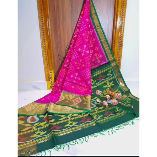 A beautiful pattern of ikkat design in sico Pattu saree with a big handloom weaving border with a contrast color pallu and unstitched blouse