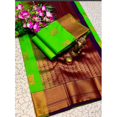 A beautiful party wear semi soft silk saree with all over silver, Golden Colors Jari buttas with heavy weaving pallu comes with contrast color blouse -JKS-25