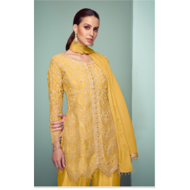 Pure Fendy Silk with Heavy Embroidery Sequence Work Fully Stitched Top–Sharara–Dupatta Set-NSR‑887-G