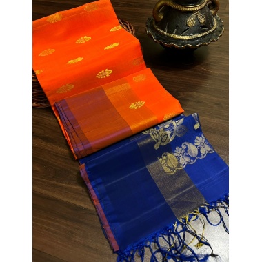 PURE HANDLOOM SMALL MOTIFS SOFT SILK SAREES Pure Handloom soft silk sarees, entirely body with small size zari moti work in entire saree with kaddi zari work on both sides Pallu : Rich zari weaved contrast pallu Blouse : contrast plain colour Blouse (pallu colour) with both sides kaddi zari work |