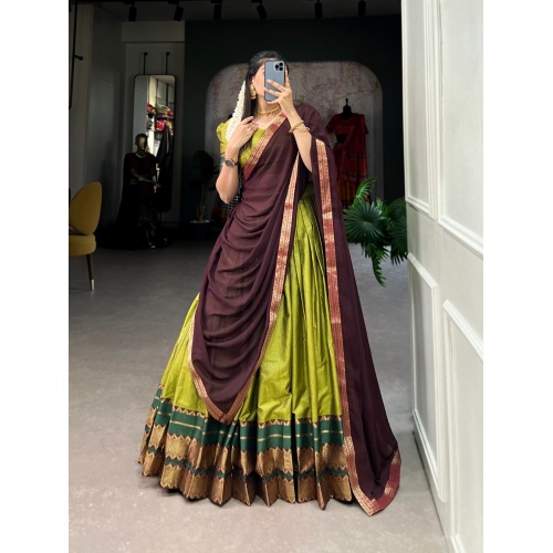 Product type: Immerse yourself in tradition with Our South Style Poly Cotton Half Saree, Paired with an Elegant Georgette Dupatta