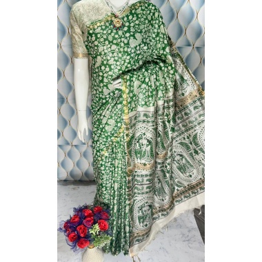 Saree fabric:Semi Katan silk saree with block madhubani print
