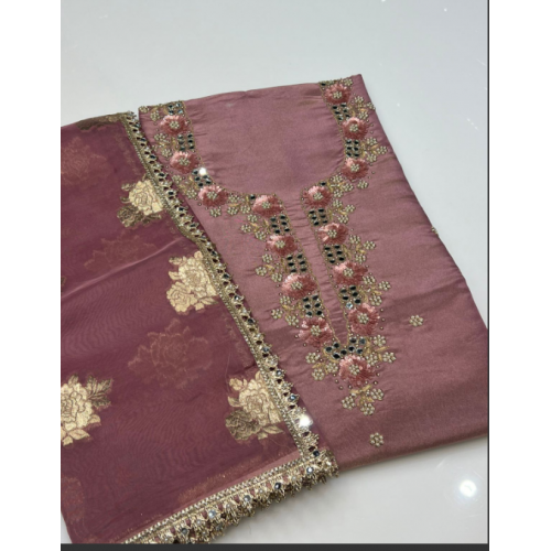 Step into understated luxury with this beautifully curated three-piece ensemble, designed to blend shimmer, texture, and tradition handwork Embroidery | Organza Zari Buta Dupatta | Natural Crepe Bottom