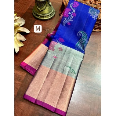 Saree work:Pure Handloom Kanchipattu High valued Softsilk sarees weaved with silvery& Golden Jari with big size meenakari motifs along with Silver and Gold jari with long Boarders kanchi pattu saree