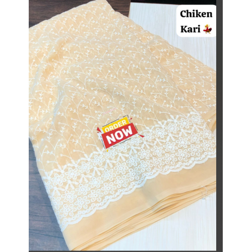 We are presenting you a collection of chiken kari work saree with unstitched blouse . We are presenting you a collection of chiken kari work saree with unstitched blouse . We are presenting you a collection of chiken kari work saree with unstitched blouse . New arrival of ocassional wear for any time with chiken kari work in chiffon fabric .