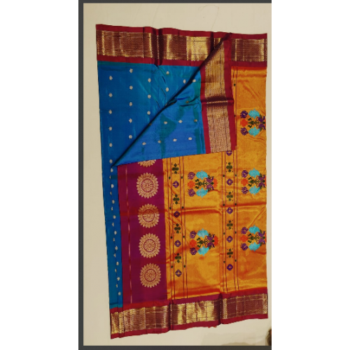 Product type:Paithani silk sarees are renowned for their luxurious texture, intricate designs, and rich heritage. Originating from Yeola in Maharashtra, these sarees are handwoven by skilled artisans using the finest silk and pure zari.