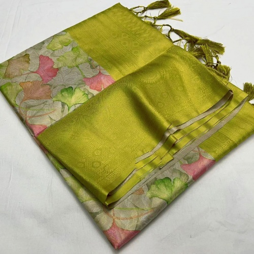 :Digital print work soft silk saree with gold jari weaving contrast color border and pallu -DG95