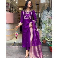 Product type: Janki presenting a party wear readymade purple color silk suitt with embroidery work with zari weaving pattern