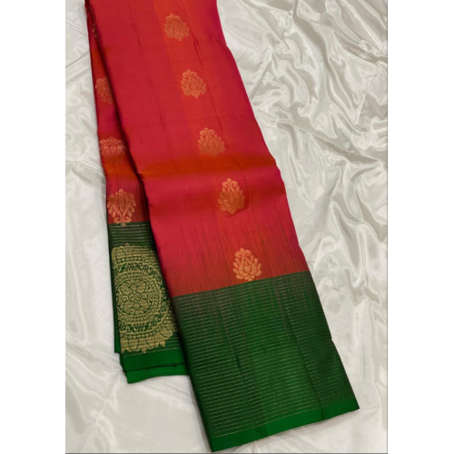 We are bringing you a beautiful party wear silk mark certificate 1g zari Kanchipuram pure silk contrast traditional border butta and body butta.