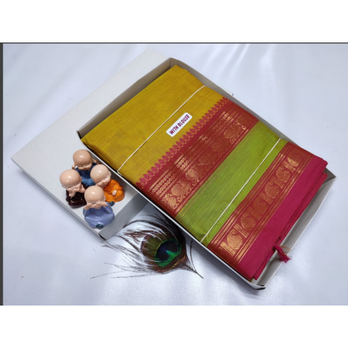 A beautiful party and casual wear Kanchi cotton saree with temple weaving pattern with contrast border and pallu .Product type:A beautiful party and casual wear Kanchi cotton saree with temple weaving pattern with contrast color border and pallu