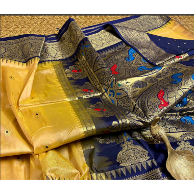 Product type: A perfect handloom Narayan pet pattu sarees all over Zari woven Meena Motti pattern with Kanchi temple borders.