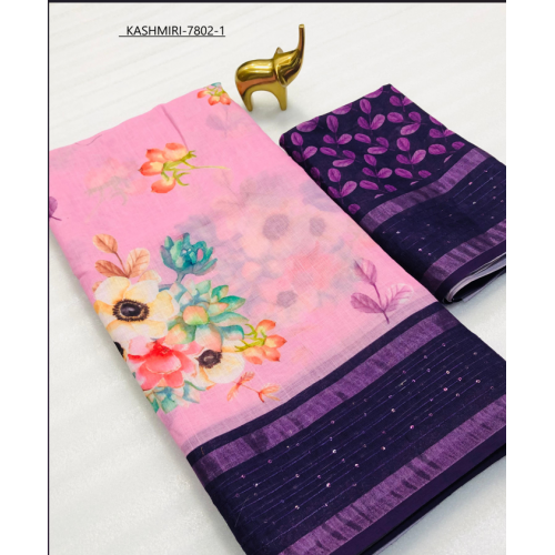 Product type: Beautiful Sequence work in soft Linen fabric with print work all over the saree with contrast color border and unstitched Blouse piece