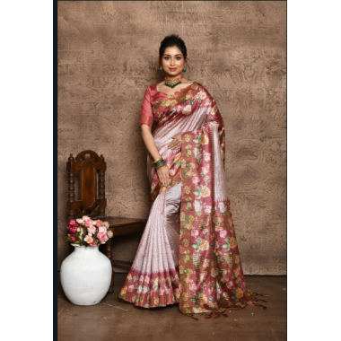 A beautiful Soft Tusar Silk Saree with all Over Beautiful Print and Contrast Floral Print on Pallu and Border with Contrast Blouse Piece and Tassels at Pallu.