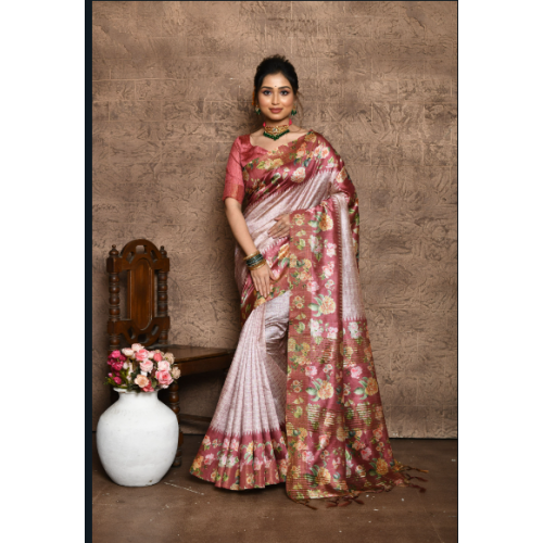Product type: A beautiful Soft Tussar Silk Saree with all Over Beautiful Print and Contrat Floral Print on pallu and Border with Contrast Blouse Piece and Tassels at pallu