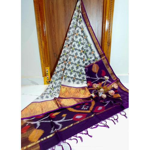 A beautiful pattern of ikkat design in sico Pattu saree with a big handloom weaving border with a contrast color pallu and unstitched blouse