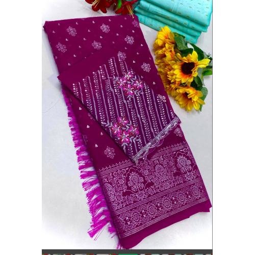 We are presenting a new arrival of georgette fabric party and occasional wear georgette saree with embroidery work blouse unstitched piece.