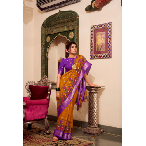 Product type: Vedanti brand presenting you a kalamkari print with zari weaving border in Poly cotton fabric.