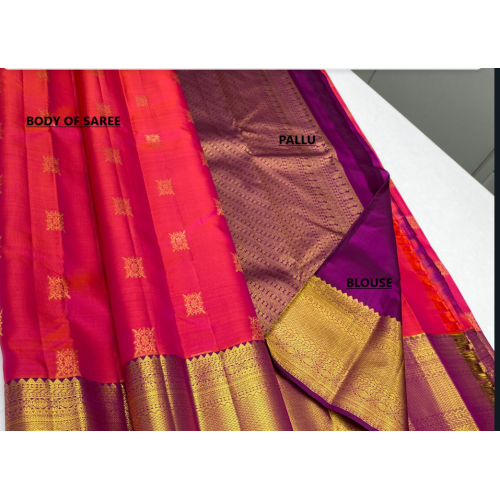 A silk mark certificate pure Kanchipuram Silk Saree with 1G Pure Jari, all over body with weaving Jari Butta with double side contrast borders with rich pallu attached with contrast blouse.
