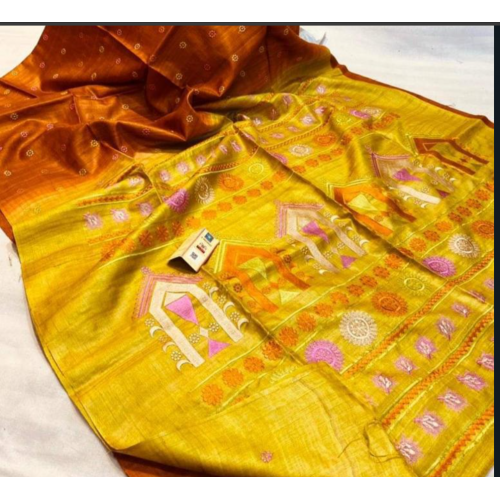 Pure handloom Tusar ghicha silk saree with embroidery and print work with unstitched blouse