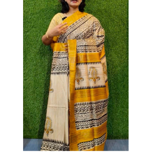This beautiful handwoven Pure Tussar Ghicha Silk Saree in beige and yellow color sounds stunning with a beautiful print work in black color with unstitched blouseProduct type: This beautiful handwoven Pure Tusar Ghicha Silk Saree in beige and yellow color sounds stunning!