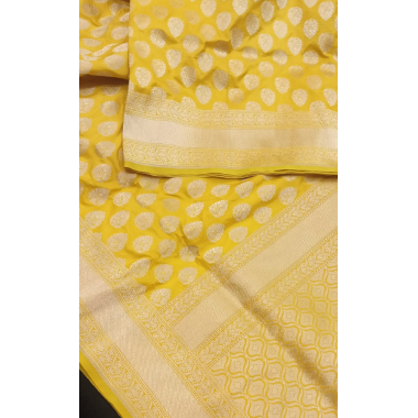 Adorn your personality with our spellbound Handloom Banarasi Silk Saree. The yellow color Pure katan Silk saree dominates with the alluring zari work in jaal pattern which gracefully oozes luxury and richness to your look. This ornamentation of zari works makes the saree look traditional yet glamorous. |