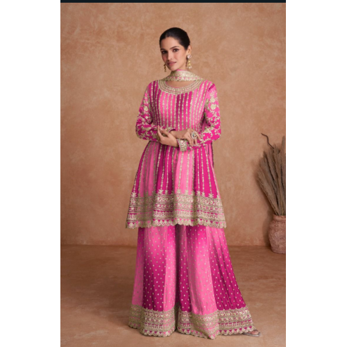 Pure Fendy Silk with Heavy Embroidery Sequence Work Fully Stitched Top–Sharara–Dupatta Set-NSR‑887