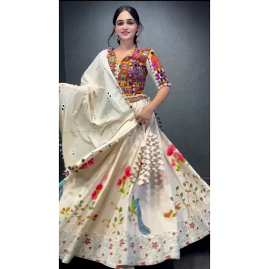 Product type: A party wear QRC presenting a party wear creamish white color semistitch lehengha