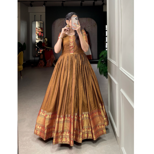We are presenting a traditional wear narayanapet fabric readymade gown with weaving work .