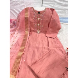 Product type: Featuring beautiful heavy Suit Set which is beautifully decorated with intricate hand embroidery, Zari weaving . It is paired with matching pants and embroidery Dupatta in Organza With Embroidery work in neck .