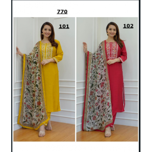 Type: Beautiful Festivel Collection just launched by intricate hand embroidery details on these Maroon and Must Yellow Reyon Silk Sets paired with matching pants and dupatta is sure to see you through festive occasions.