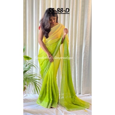 Creations Out of Imagination Presents Attractive and rich look Saree Saree Fabric:- Pure Satin Crepe Full Saree Hot Fixed Diamonds With Matching Diamond Blouse Piece 10 Colour Available