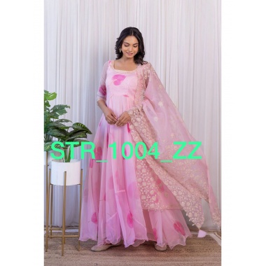 Product type: A beautiful party wear long gown with flower print work in Organza fabric