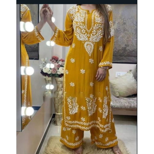 Product type: A beautiful designer suit on heavy reyon fabric with inner and Chain-Stitch work with Palazo have a Chain-Stitch work