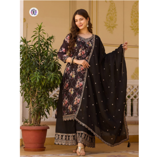 Pure Fendy Silk with Heavy Embroidery Sequence Work Fully Stitched Top–Sharara–Dupatta Set-NSR‑887