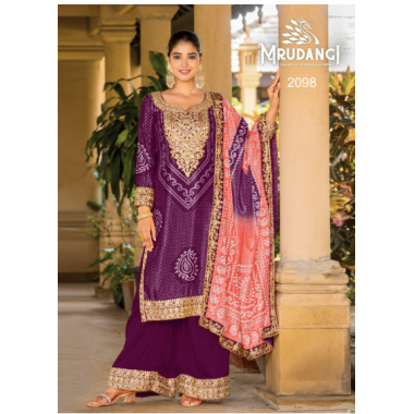Product type: Full Stitch Convenient and ready-to-wear Real chinon fabric palazzo salwar suit with embroidery and mirror work .</p Product type: This MRUDANGI outfit sounds stunning and Perfect for special occasions or everyday glamour with real chinon Fabric