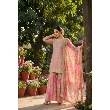 Ready‑Made Natural Crepe Silk Printed Kurti with Palazzo & Gota Dupatta-ZEENAT- D.No: ZN‑1001