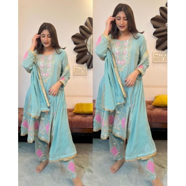 Pure Fendy Silk with Heavy Embroidery Sequence Work Fully Stitched Top–Sharara–Dupatta Set-NSR‑887-G